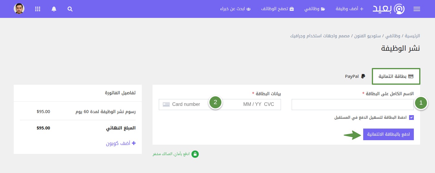 يوفر موقع بعيد وسائل مختلفة للدفع يمكنك الاختيار فيما بينها بعد إدخال بيانات الوظيفة ومعاينتها.
