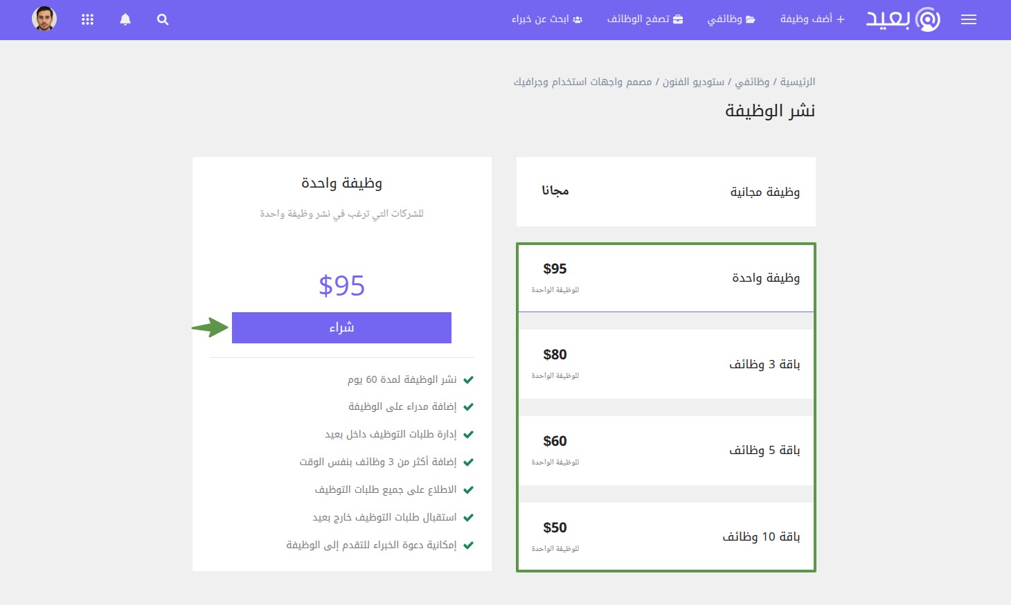 بإمكانك نشر وظيفة واحدة مقابل 95$، أو اختيار باقة من الباقات المتاحة لنشر أكثر من وظيفة بأسعار مخفضة.